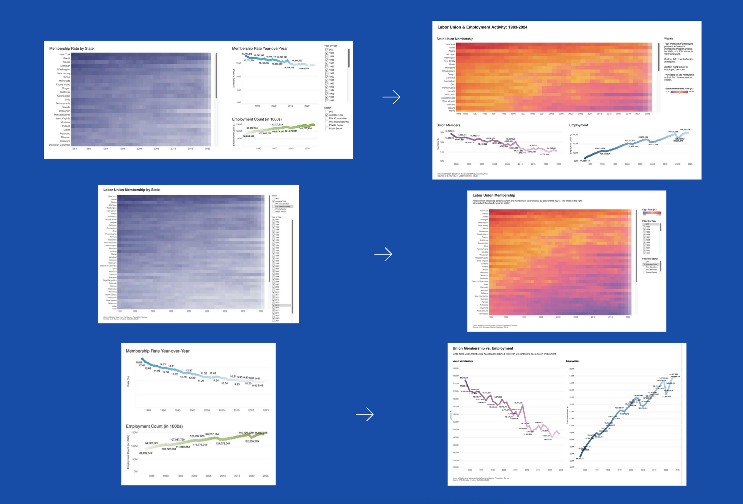 My goal with the visuals below was to familiarize the viewer with key “players” in the realm of labor unions — including historic state union member rate employment counts — without visually overwhelming them with decades’ worth of data.